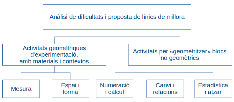 - Incorporar més geometria i raonament visual als blocs de continguts no estrictament geomètrics (numeració i càlcul; canvi i relacions; i estadística i atzar).