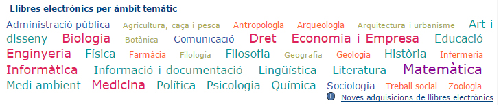 El nombre de llibres va creixent i podeu estar al dia de les noves incorporacions de llibres electrònics a través de la llista que trobareu sota el núvol d’etiquetes del Catàleg: Noves adquisicions de llibres electrònics.